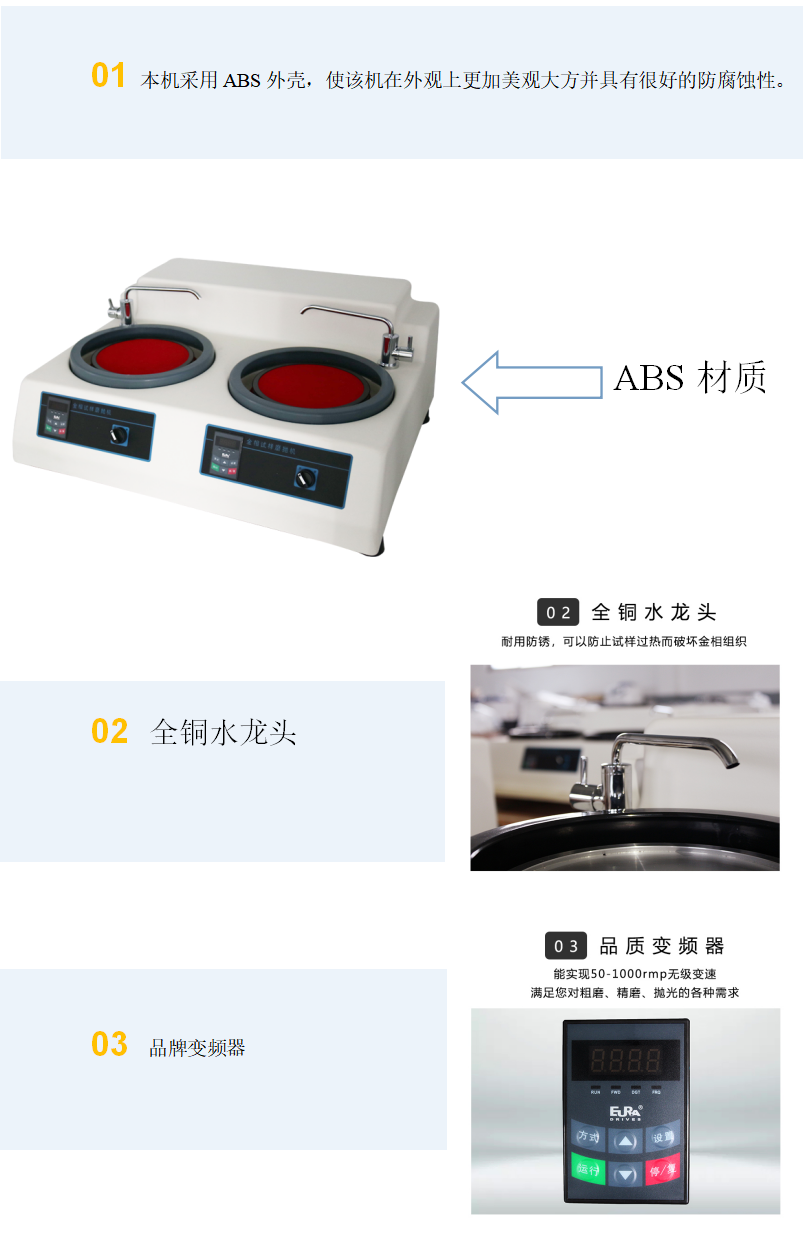 本機(jī)通過(guò)變頻器調(diào)速,可直接獲得50~1000轉(zhuǎn)/分鐘之間的轉(zhuǎn)速,從而使本機(jī)具有更加廣泛的應(yīng)用性。是用戶用來(lái)制作金相試樣必不可少的設(shè)備。