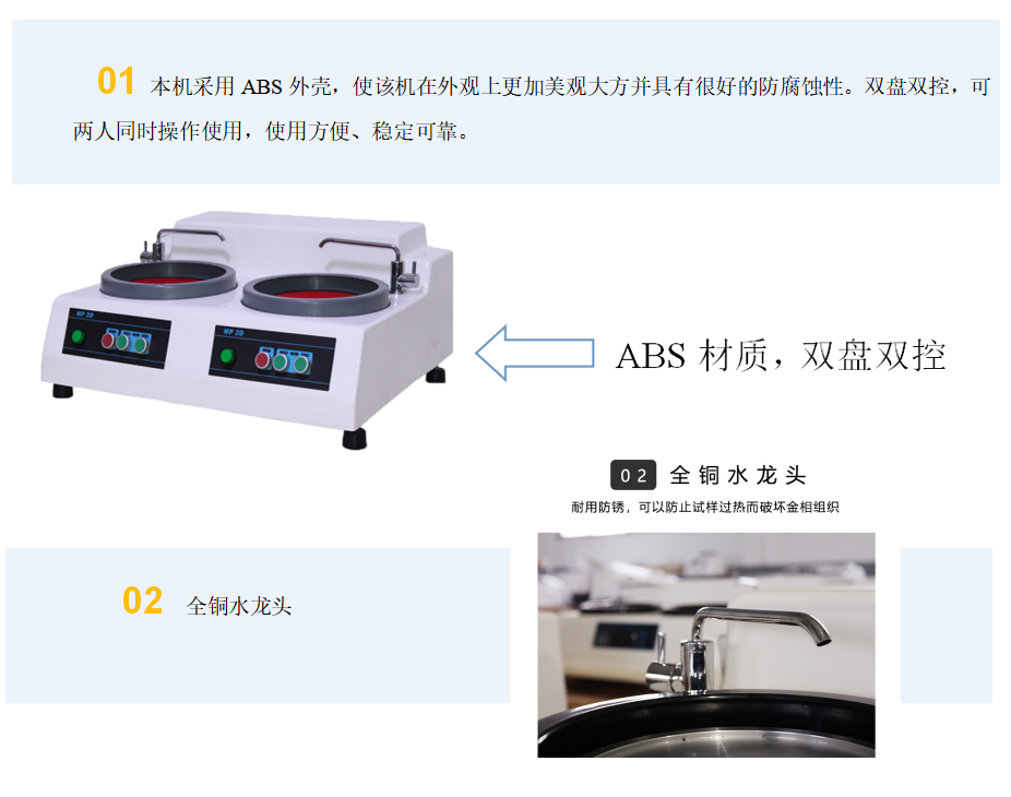 本機帶有冷卻裝置,可以在研磨拋光時對試樣進行冷卻,以防止因試樣過熱而破壞金相組織。該機使用方便、安全可靠,是工廠、科研單位以及大專院校實驗室的理想制樣設備。